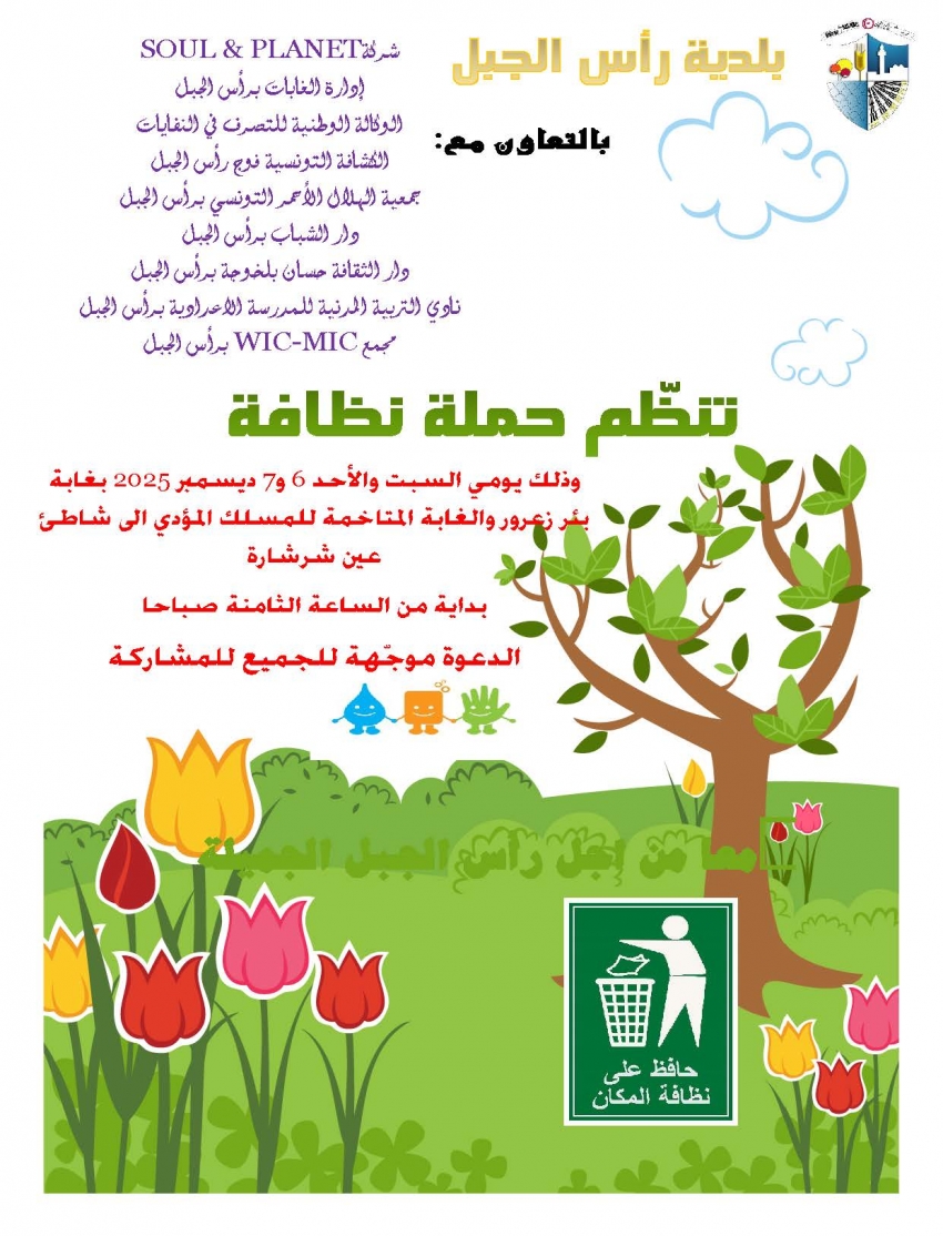 تعلم بلدية رأس الجبل كافة المواطنين والجمعيات والمؤسسات انه تقرّر تنظيم حملة نظافة يومي السبت والأحد 6 و7 ديسمبر 2025 بغابة بئر زعرور والغابة المتاخمة للمسلك المؤدي الى شاطئ عين شرشارة بداية من الساعة الثامنة صباحا بالتعاون مع: