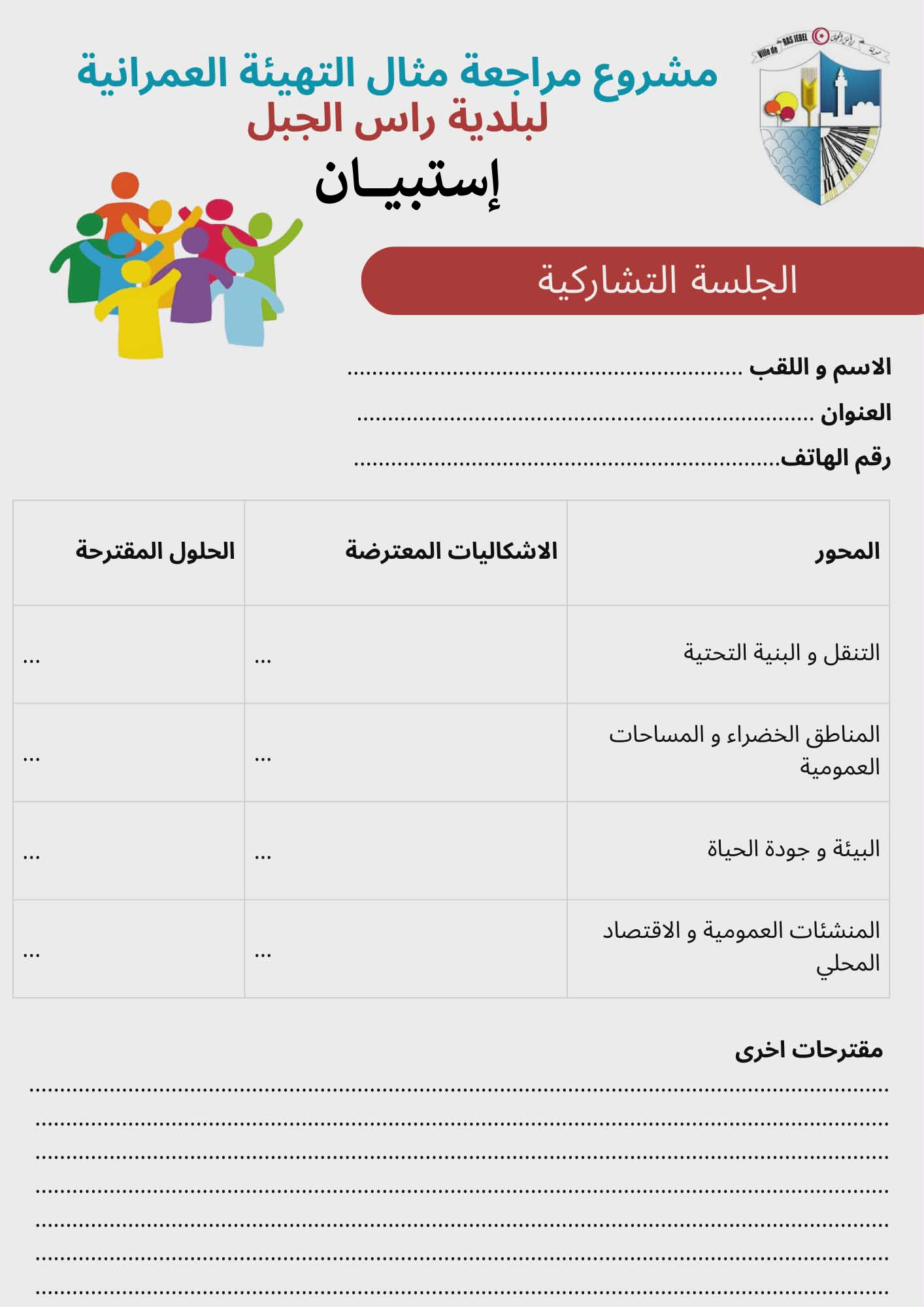 كما تعلم بلدية رأس الجبل كافة المواطنين الذين يتعذّر عليهم حضور الجلسة، أنه يمكنهم تعمير وثيقة الاستبيان على الرابط التالي(تحميل وثيقة الاستبيان) وإيداعه بالمصلحة الفنية للبلدية.